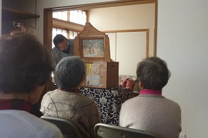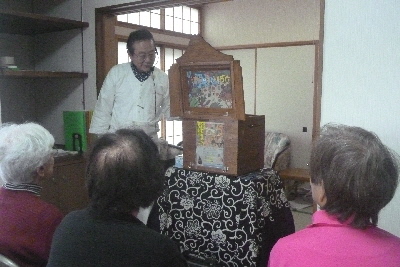 町内会のデイケアが定着しています。会場を提供されているヤマザキさん宅で三枝会長他皆様が地域の高齢者の方々をお招きして楽しい居場所作りが拡大中です。今日は、1時間の持ち時間で30分間を街頭紙芝居…